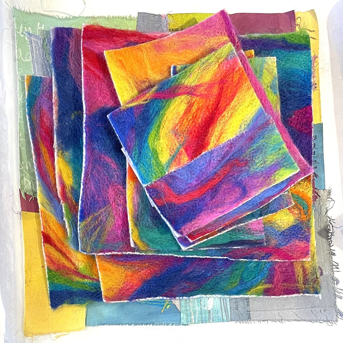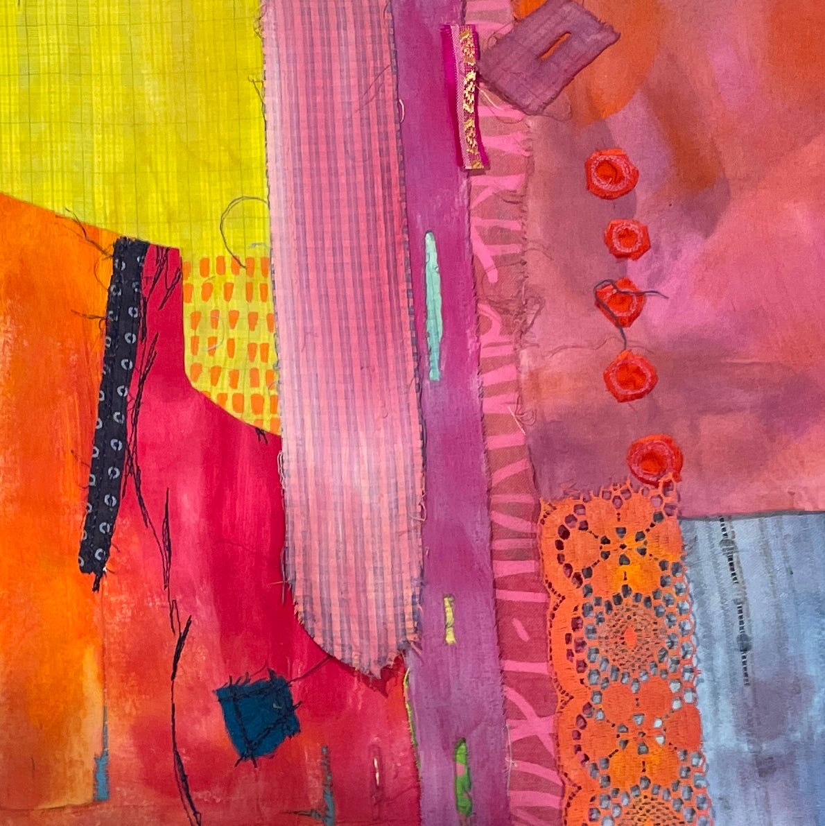 But this collage is going to be a challenge to stitch precisely because it hasn’t got an order or rhythm or pattern to play with…it’s completely abstract. I kind of love it already, just as a collection of fabrics. And yeah, OK, it’s not completely abstract because I did think carefully about where each piece went. But the stitching part is where I usually go off the rails, and start to throw stuff around, do too much, and make things waaaay too complicated. Sigh. Story of my life. If you see me doing that with this piece, stop me - please! I haven’t time!